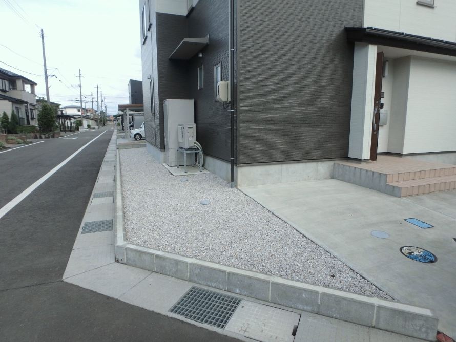 新築住宅外構・駐車場コンクリート・ブロック積み・アルミフェンス・タイル貼り・石灰砂利敷き・植栽・その他