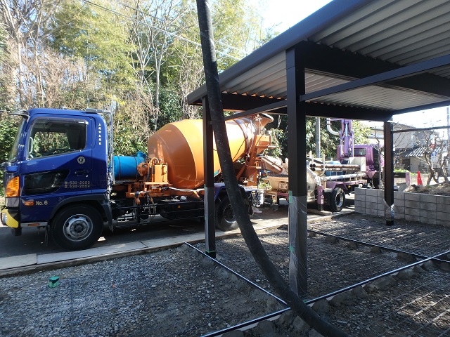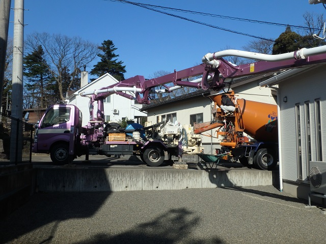 家裏のコンクリート打設の為、コンクリートポンプ車にて打設しています。